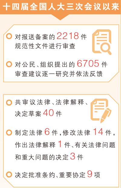 加强经济领域立法,完善社会民生领域立法,健全生态环境领域立法……全国人大常委会工作报告介绍了十四届全国人大三次会议以来的立法工作,给代表们留下了深刻印象。